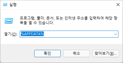 TIP : 윈도우키 + R 키를 눌러 %appdata% 입력해도 되지만 윈도우 탐색기 창에서 %appdata%를 넣고 엔터해도 같은 디렉토리로 이동 됩니다.