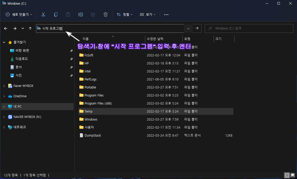 1. 탐색기 창에 "시작 프로그램" 또는 "Programs Startup" 기입 후 엔터
